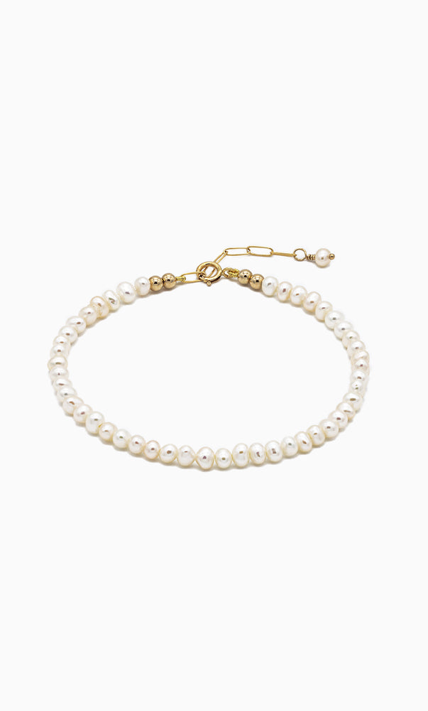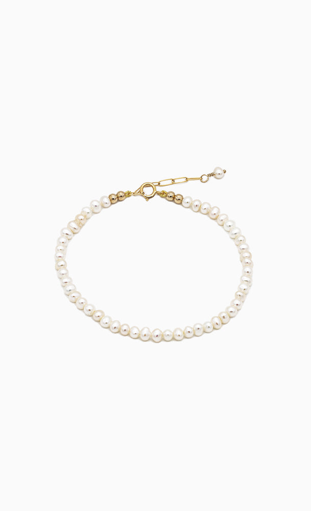 Kombiniere dieses Perlenarmband mit einem feinen Goldkettenarmband und mit dem Perlenchoker Mina für einen eleganten Auftritt.