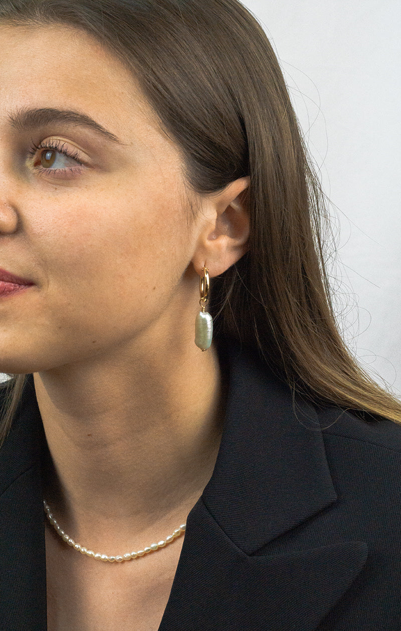 Die Goldcreolen Ava verbinden klare Formen mit der natürlichen Ausdruckskraft von Biwa-Perlen. Die länglich geformten Süßwasserperlen zeigen ihre organische Struktur bewusst und bringen eine ruhige Lebendigkeit in das Design.