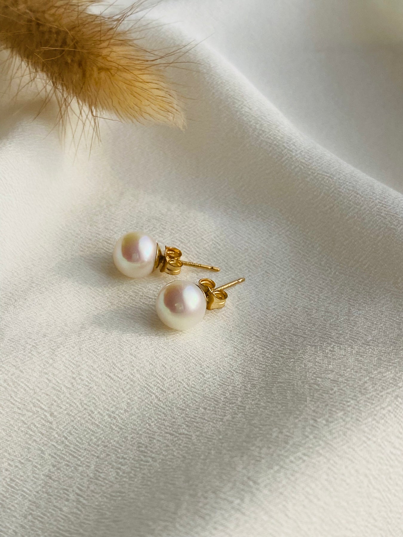 Die Nia Pearl Studs mit runden Süßwasserperlen sind ein klassischer Begleiter mit ruhiger Präsenz. Die naturweißen Perlen mit sanftem Lüster wirken klar, elegant und ausgewogen – ein Schmuckstück, das sich mühelos in jeden Stil einfügt.